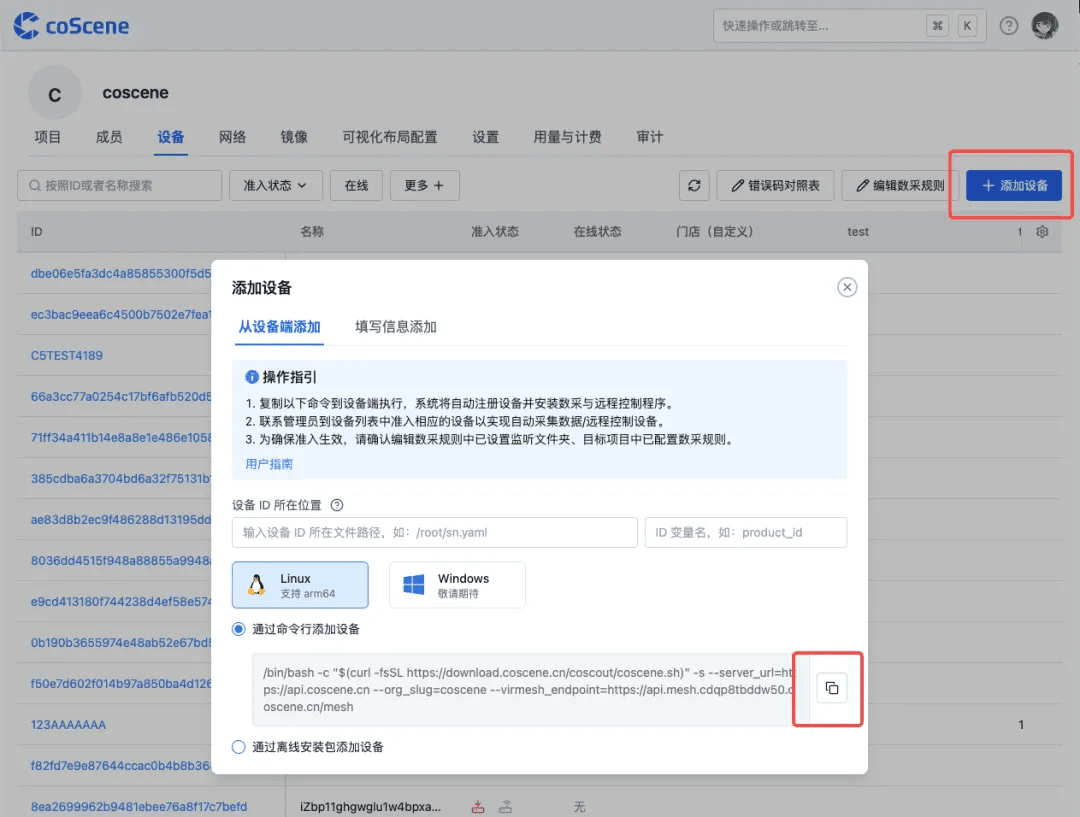 点击【添加设备】按钮,复制安装命令