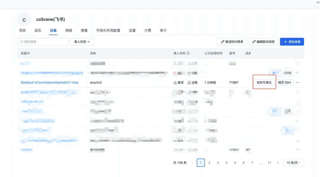 当设备准入后,在「组织管理」里「设备」页面列表中点击【实时可视化】按钮,即可查看设备的实时情况。
