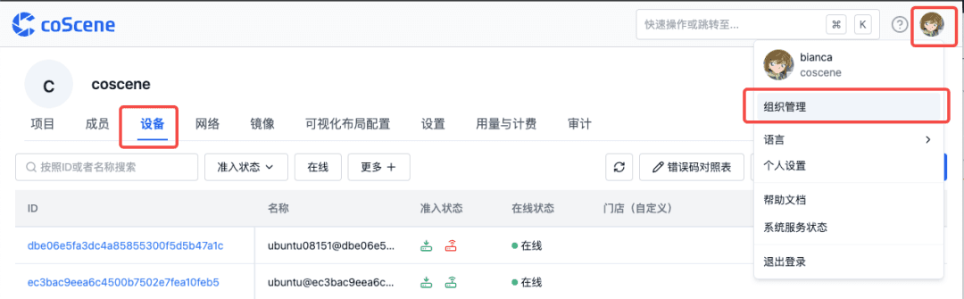 进入「组织管理」-「设备」页面
